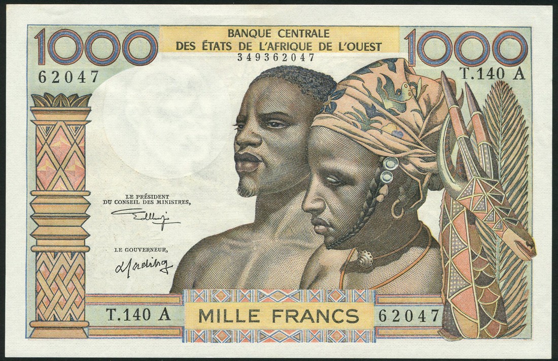 (x) Banque Centrale des Etats de l'Afrique de l'Ouest, Ivory Coast issue, 1000 francs (4), ND (1977), all prefix T.140A, multicoloured, man and woman at centre, signature 10, reverse multicoloured, man and rope suspension bridge and river