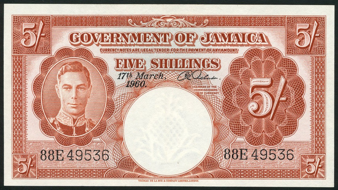 Government of Jamaica, 5 shillings, 17 March 1960, serial number 88E 49536, red and orange on cream, portrait King George VI at left, reverse coat of arms top centre