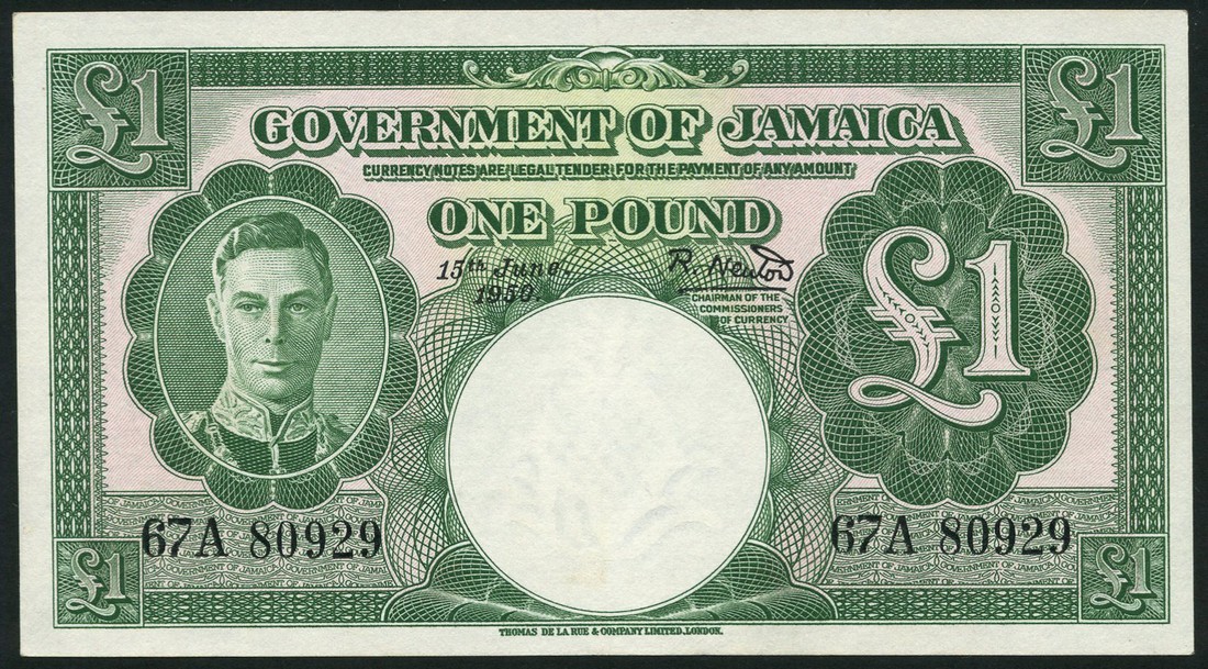 Government of Jamaica, £1, 15 June 1950, serial number 67A 80929, green and pale pink, portrait King George VI at left, reverse, coat of arms top centre