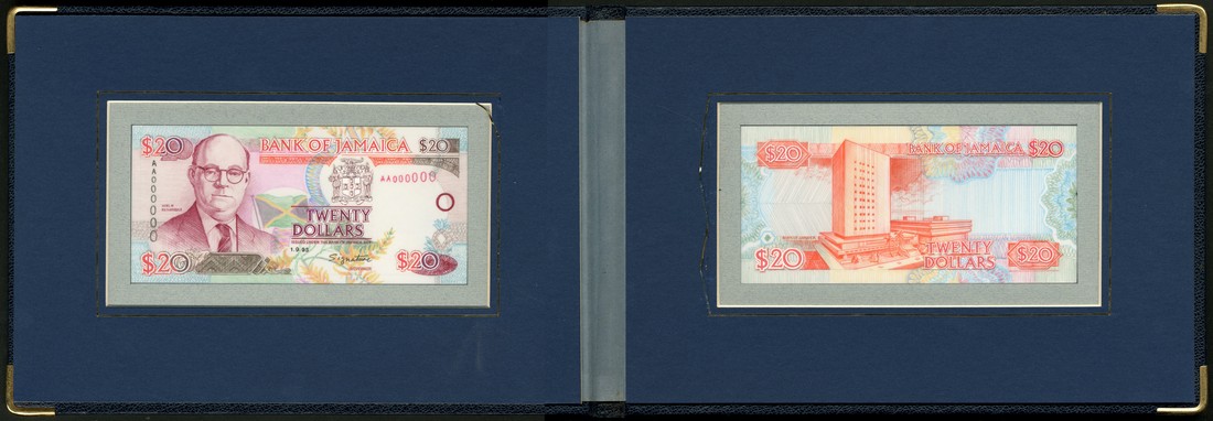 (x) Bank of Jamaica, a presentation folder containing an obverse and reverse essay for a proposed issue of $20, 1 September 1995, serial number AA 000000, multicoloured, Noel Nethersole at left, arms, flag and flowers right centre, reverse orange-red and multicoloured, bank building at centre, value at each corner