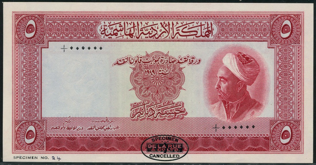 Hashemite Kingdom of Jordan, specimen 5 dinars, ND (L 1949), zero serial number, red, King Abdullah at right, reverse El Hazne, Treasury of Pharaoh at centre