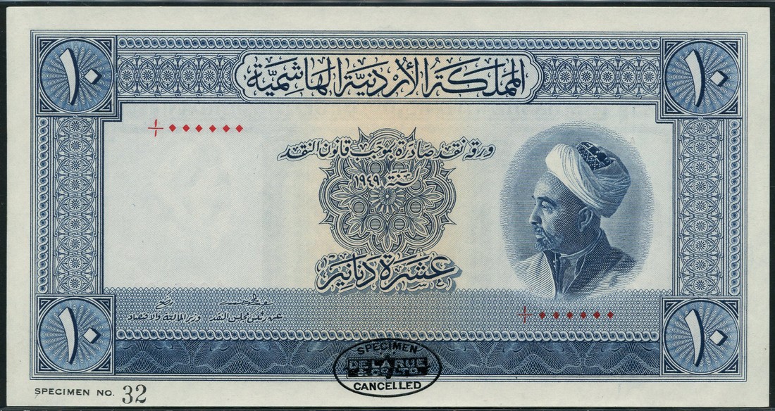 Hashemite Kingdom of Jordan, 10 dinars, ND (L 1949), serial number A/A 000000, blue grey, King Abdullah at left, reverse El Hazne, Treasury of Pharaoh at Petra at centre