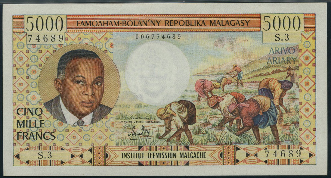 (x) Institut d'Emission, Madagascar, 100 francs, ND (1966), serial number M.27 33063, multicolour, women spinning centre and left, reverse boabab trees centre and right, 5000 francs, ND (1966), serial number S.3 74689, multicolour, portrait President P Tsiranana at left, workers in field at right, signature 3, reverse multicoloured, woman holding child, landscape