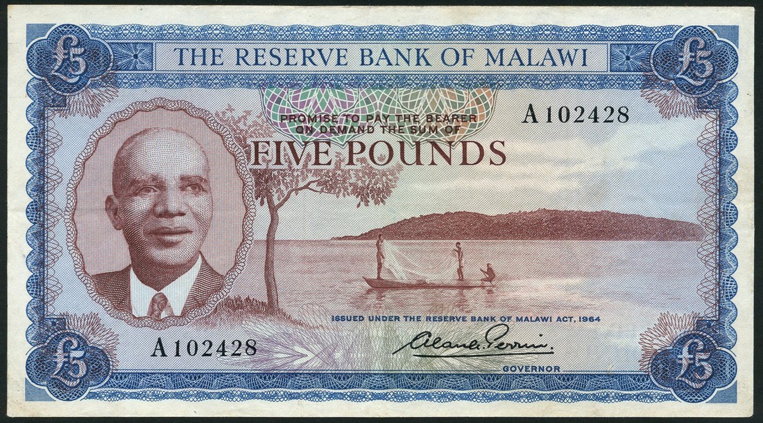 Reserve Bank of Malawi, £5, ND (L 1964), serial number A102428, blue and brown on multicolour, portrait of Dr Hastings Kamuzu Banda at left, river scene centre and right, reverse women picking tea, mountains in background