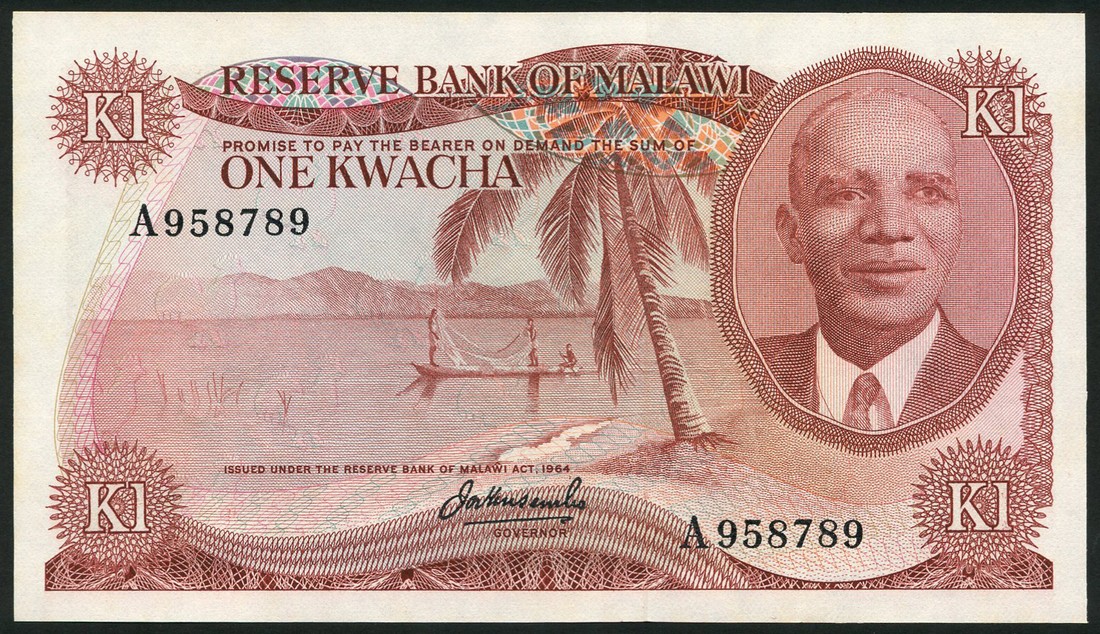 Reserve Bank of Malawi, 1 kwacha (2), ND (1973), consecutive serial numbers A958789/90, red brown on multicolour underprint, portrait Dr Hastings Kamuzu Banda at right, fishermen in lake at centre, reverse, worker harvesting, very pleasing
