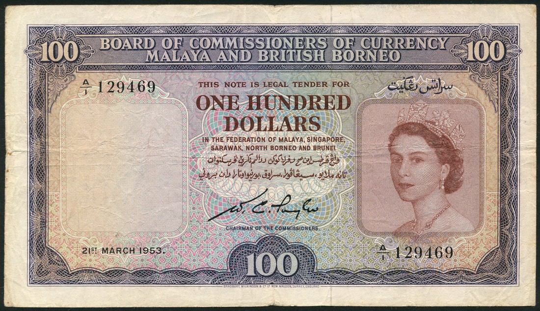 Board of Commissioners of Currency Malaya and British Borneo, $100, 21 March 1953, serial number A/I 129469, Multicolour, portrait Queen Elizabeth II at right, reverse, 16 coats of arms,