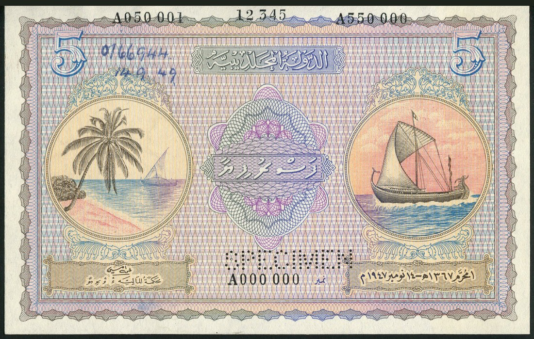 (†) Maldivian State, Government Treasurer, specimen 1/2 rupee, specimen 1, 2 and 5 rupees, all AH 1367 (1947), all serial number A000000, multicoloured, dhow and palm tree at centre