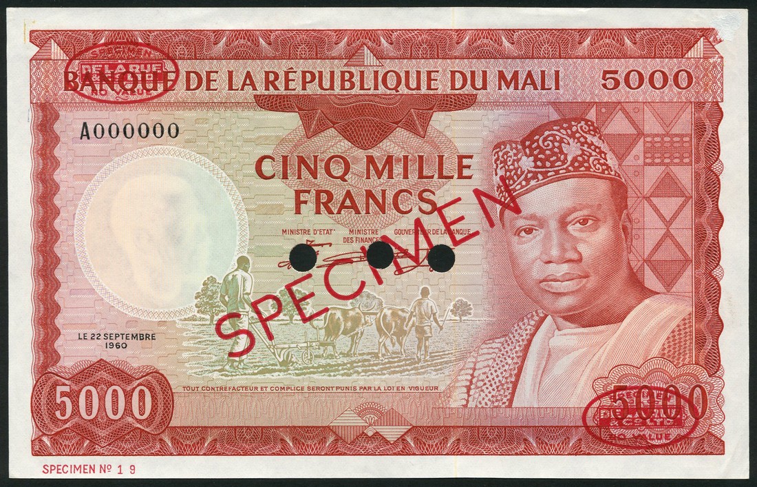 (†) Banque de la Republique du Mali, a specimen set of the 22 September 1960 (1967) Issues, all 000000 serial numbers, all Modibo Keita at right, comprising 50 Francs, prefix A, purple, reverse woman at right, village at centre; 100 Francs, prefix K1, brown, reverse old man at right, canoes at centre; 500 Francs, prefix G, green, reverse longhorn cattle; 1000 Francs, prefix J, blue, reverse Djenne mosque; and 5000 Francs, prefix A, red, reverse market scene and building, all overprinted SPECIMEN in red with two De La Rue specimen ovals on obverse and reverse, three punch holes