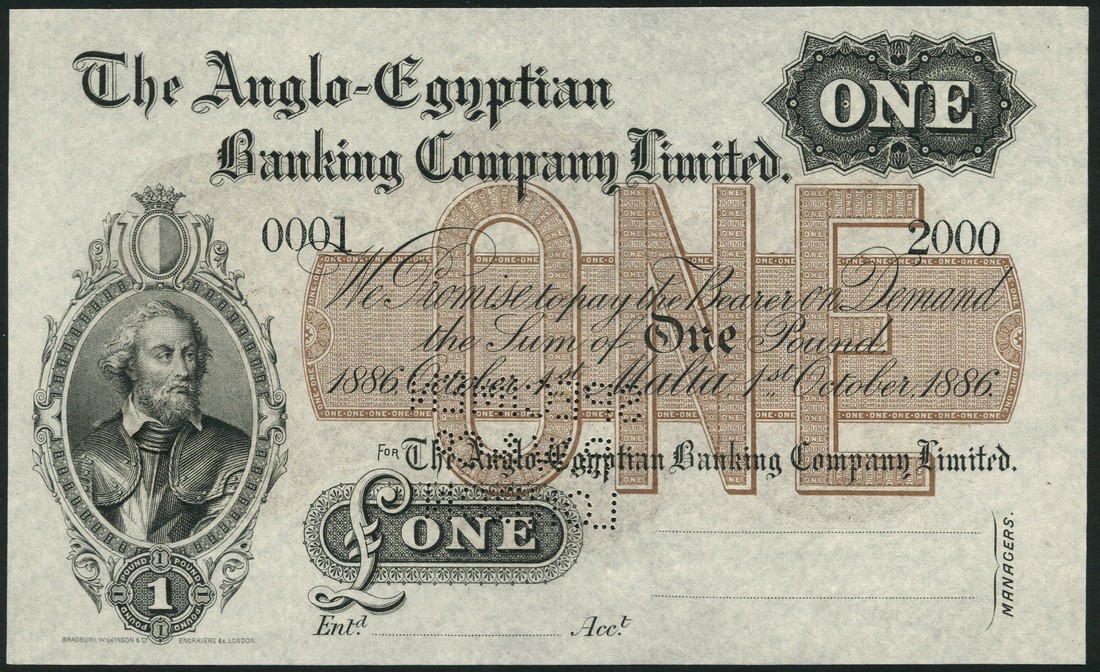 (†) Anglo-Egyptian Banking Company Limited, Malta, specimen £1, Malta, 1 October 1886, serial number 0001-2000, black and white, value in brown panel at centre, Grand Master La Valette at left, value in black tablet low left and top right, reverse brown and white, value at centre