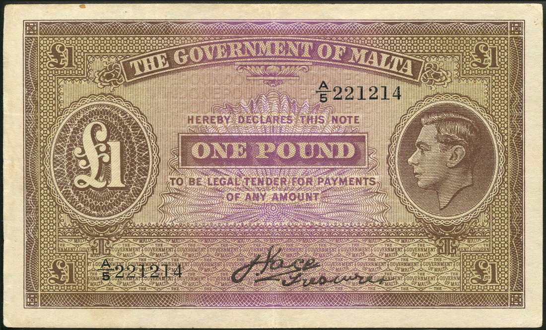 (x) Government of Malta, 5 Shillings, 13 September 1939, green and red, King George VI at right, uniface; 1 Shilling on 2 Shillings, ND (1940-old date 20 November 1918), green and pale blue, King George V at right; also 1 Shilling, ND (1943), purple and blue; 2 Shillings, ND (1942), heavier watermarked paper, brown and green; £1, ND (1940), signature J. Pace, brown and violet, all portrait of King George VI at centre or at right, uniface