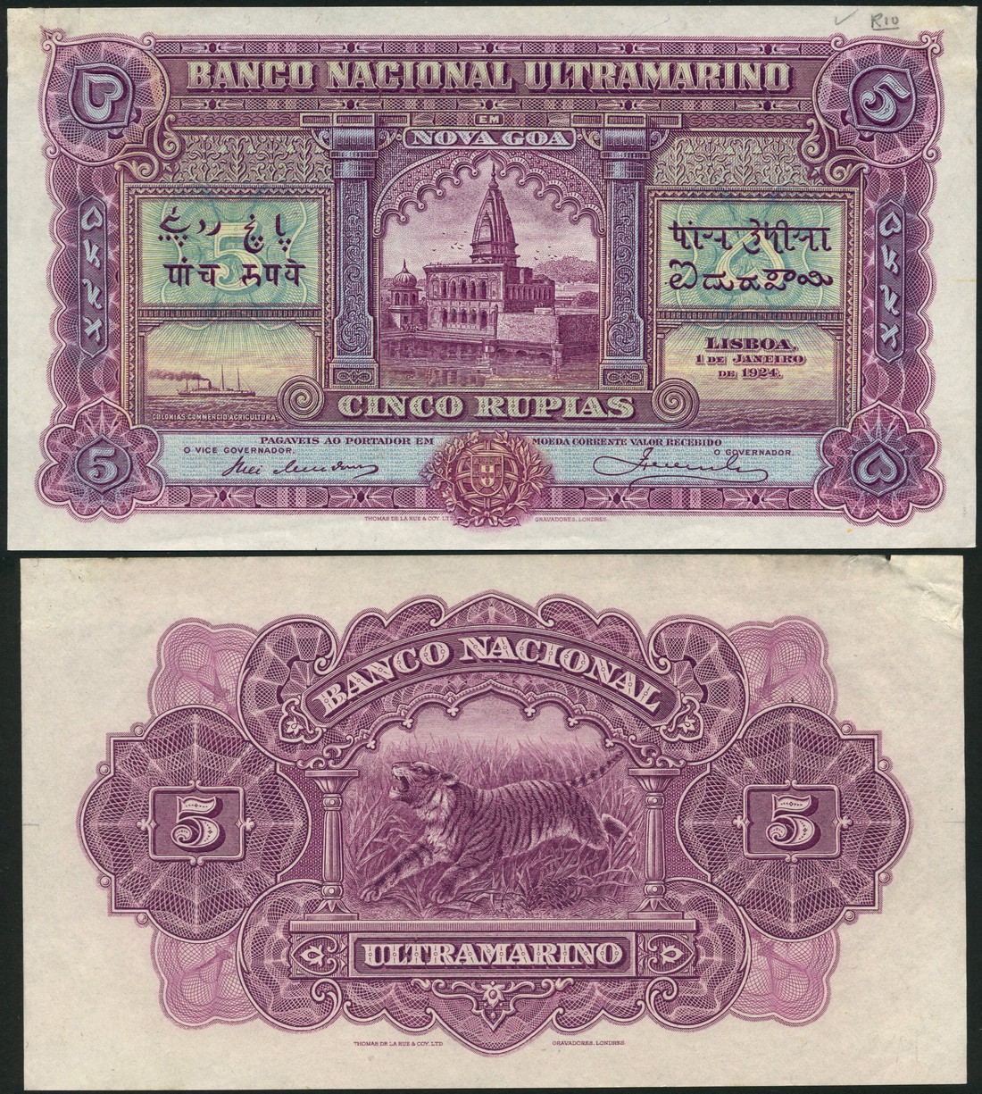 (†) Banco Nacional Ultramarino, Nova Goa, a uniface obverse and reverse colour trial 5 Rupias, 1 January 1924, no serial numbers, purple and green on pale blue and yellow underprint, floating palace at centre, arms at lower centre, value in each corner, reverse purple, tiger at centre, value in ornate guilloches at either side
