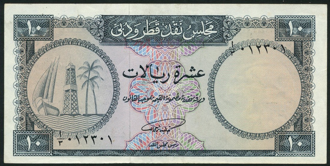 Qatar & Dubai Currency Board, 1 riyal, 5 riyals and 10 riyals, ND (1966), green, purple and black respectively, all with dhow, oil derrick and palm at left, value at each corner