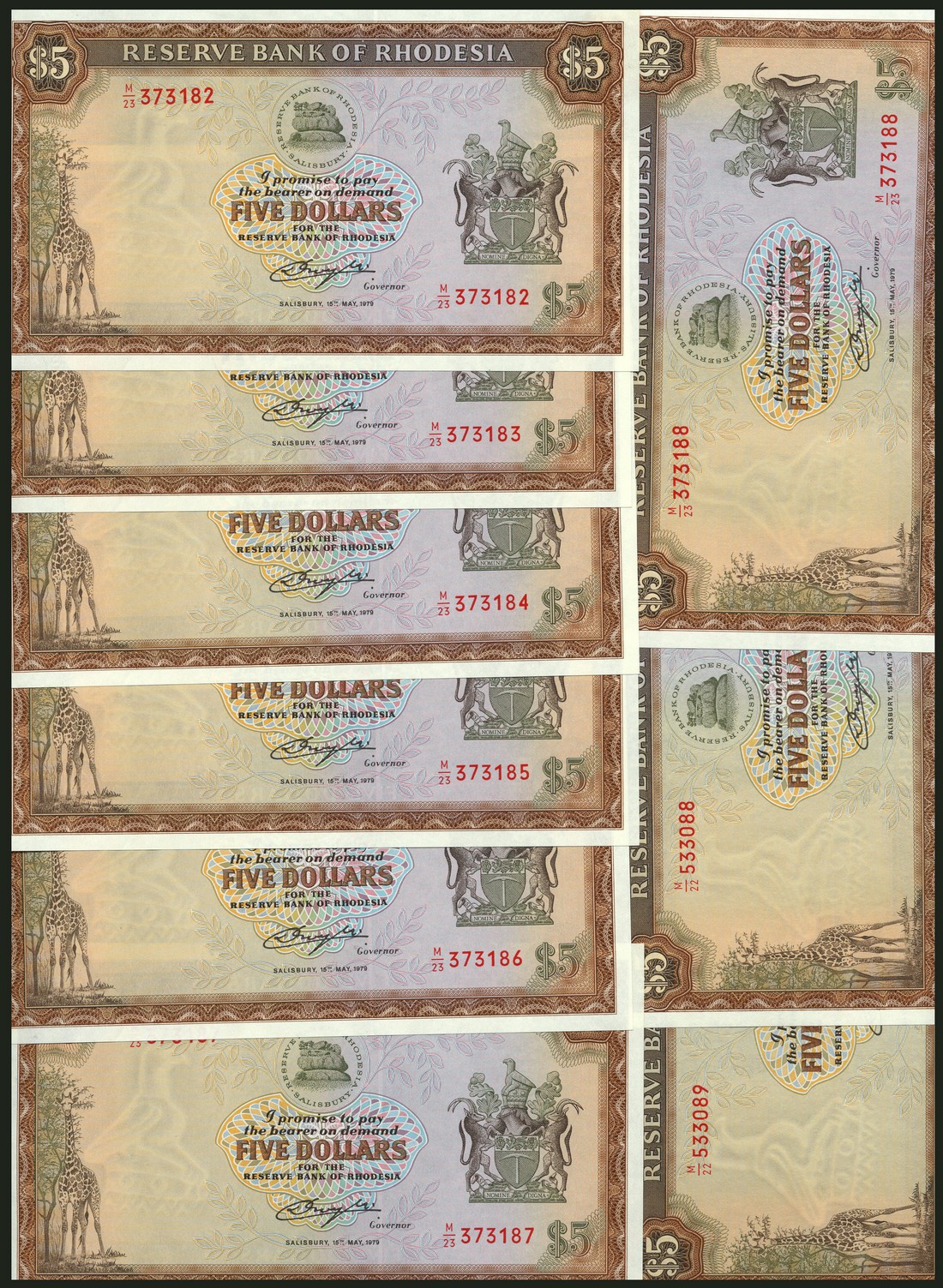 Reserve Bank of Rhodesia, $5 (9), all 15 May 1979, consecutive serial numbers M/23 373182-88, and M/22 533087-89, brown on multiclour underprint, giraffe at left, bank logo upper centre, arms at right, reverse lion and lioness at centre, a very desirable group given the serial numbers