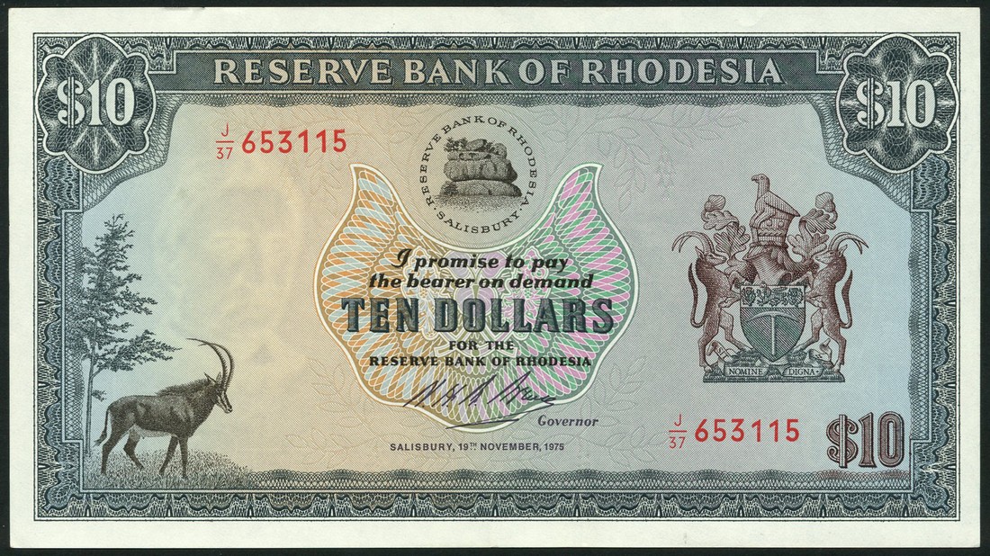 Reserve Bank of Rhodesia, $1, blue, $2, red, $5, brown and $10, blue-grey, 1978,1977,1976,1975 respectively, all arms at right, all Rhodes watermark