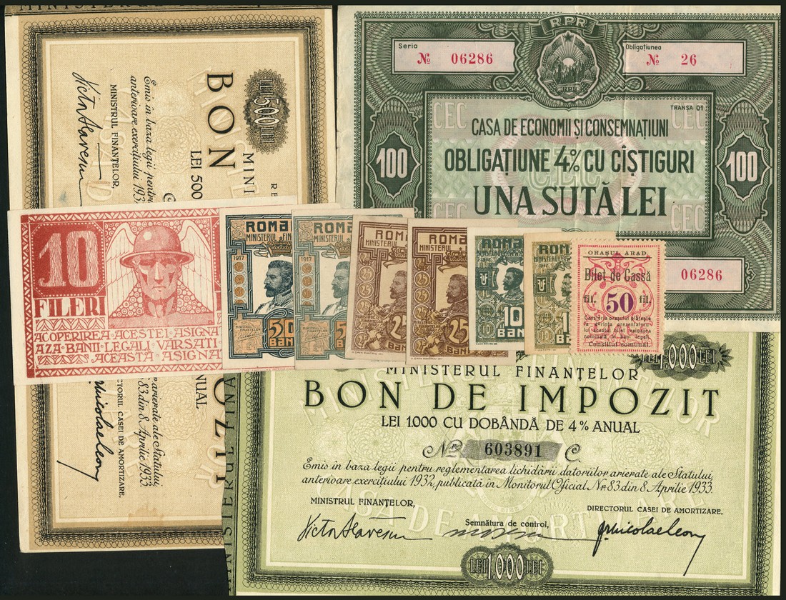 Ministry of Finance, Romania group of 11 notes comprising 10, 25, 50 bani (2 each shade variants), 1917, treasury token 50 filira (pink perforated, edge stamp), 1920, treasury assignat 10 filira, brick red, 1919, 4% debenture bonds 500, 1000 lei, brown, olive green, April 1933, 4% obligation 100 lei, dark olive on mauve underprint, 1949, series 26,