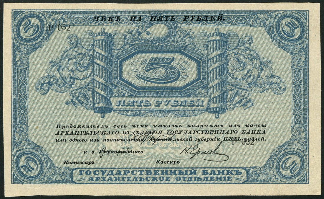 Archangel, Government Bank, red regime, 5 rubles, 1918, and white regime, 3 and 25 rubles, 1918, blue, green and pink respectively, second and third with red overprint