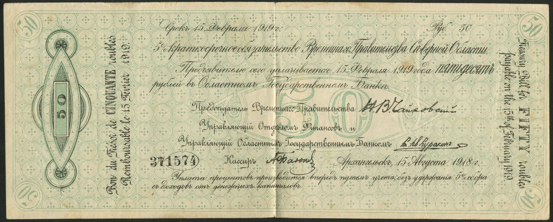 North Regional issues, Russia, 50,100,500 and 1000 rubles, 1918, Chaikovski signatures,
