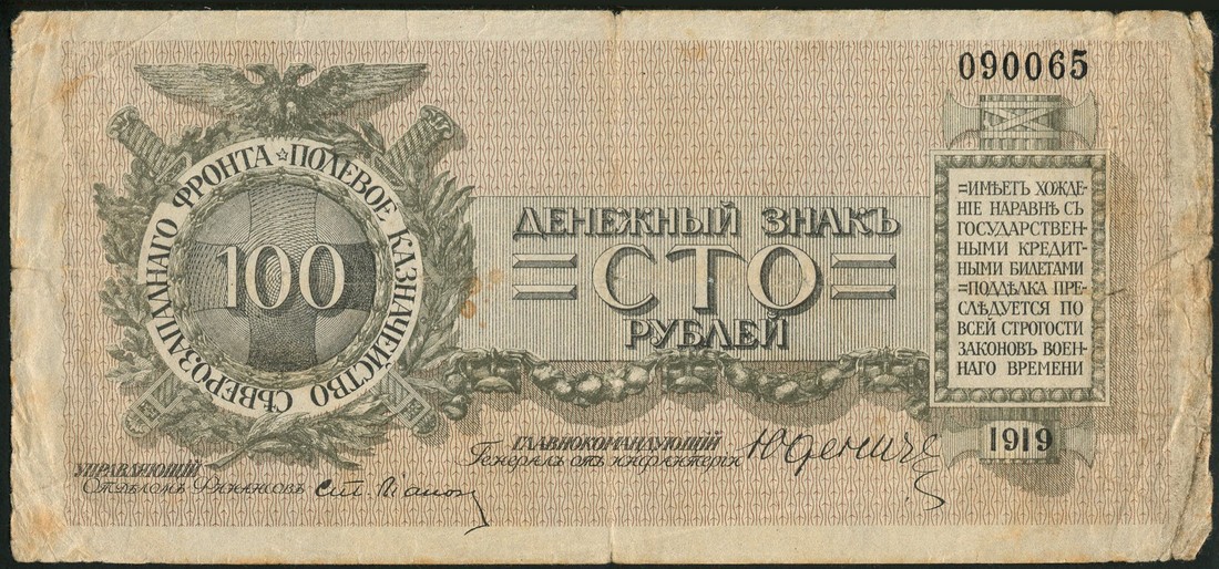 Northwest Russia, 25 and 50 kopeks, 1,3,5 and 10 rubles, 1919, 25 and 100 rubles, 1919