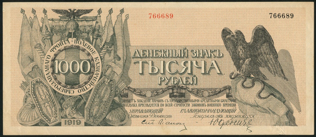 Northwest Russia, 500 and 1000 rubles, 1919, blue-grey and pale brown respectively, value at left, eagle at right