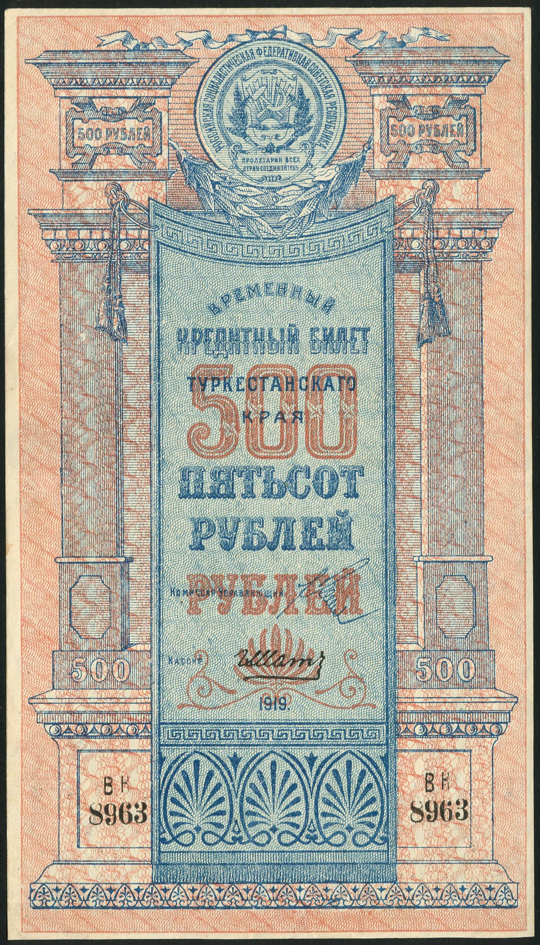Central Asia, Russia, 500 rubles, 1919, serial number 8963, blue and pink, arms top centre, reverse blue and white