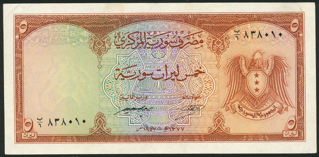 (x) Banque Centrale de Syrie, 5 livres, 1957, serial number 838010, red-brown and multicoloured, arms at right, reverse red-brown, the Citadel of Aleppo