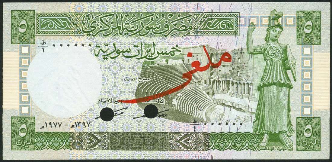 (x) Central Bank of Syria, specimen 5 livre (2), 1977,1978, black zero serial numbers, green and multicoloured, Bosra Theatre and female warrior statue