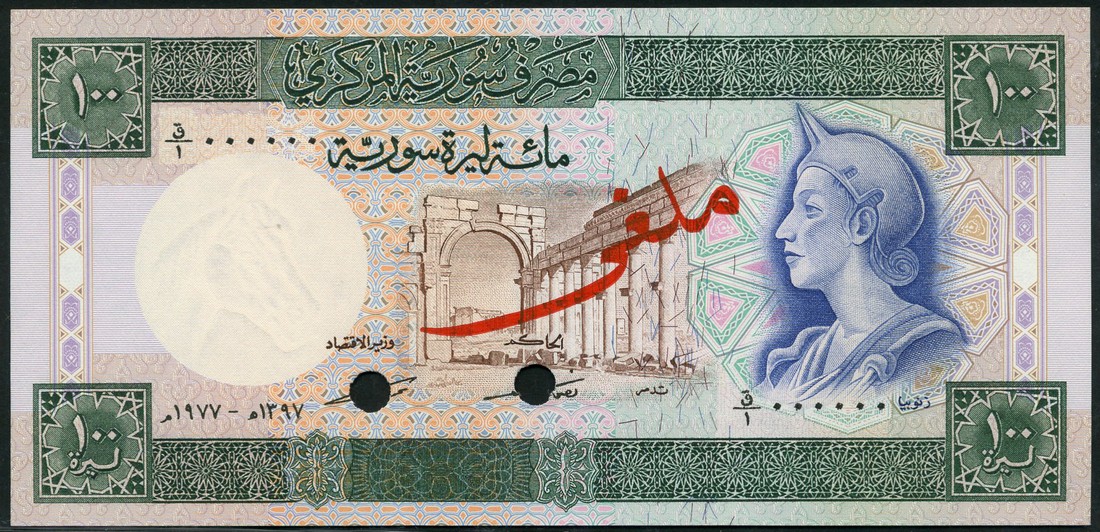 Central Bank of Syria, specimen 5 pounds (2), 1977/1978, green, specimen 25 pounds, 1978, dark blue, specimen 50 pounds, 1977, brown, and specimen 100 pounds (2), 1977/1978, greem