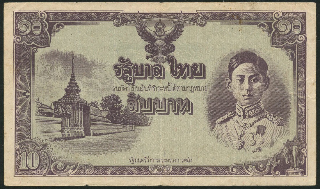 Government of Thailand, unissued 10 baht, ND (1942-44), purple on pale grey-blue underprint King Rama VIII, portal at left