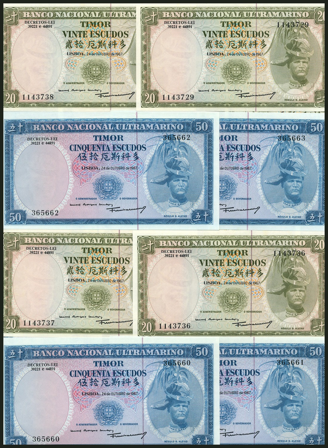 (x) Banco Nacional Ultramarino, Timor, 20 escudos, 24 October 1967, serial numbers 1143729, 1143734-8, 1130643, 50 escudos, 24 October 1967, serial numbers 365649, 365660-5, 365667, all depicting portrait of R D Aleixo at right.