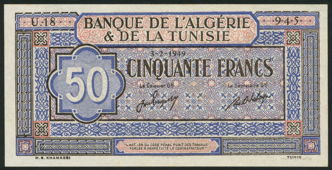 (x) Banque de l'Algerie et de la Tunisie,Tunisia, 50 francs, 3 February 1949, serial number U.18 945, black, blue and pale red, value at left