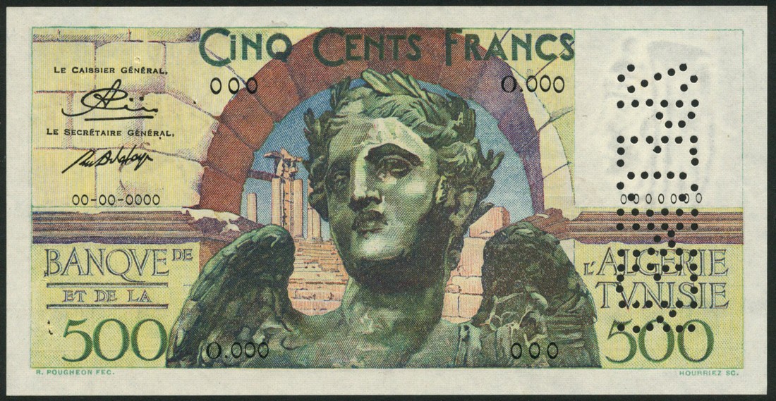 Banque l'Algerie et de la Tunisie, Tunisia, specimen 500 Francs, ND (1950), zero serial number green on yellow and multicolour underprint, winged Victory with Roman ruins in background, reverse three allegorical figures depicting labour, hole punched SPECIMEN at right