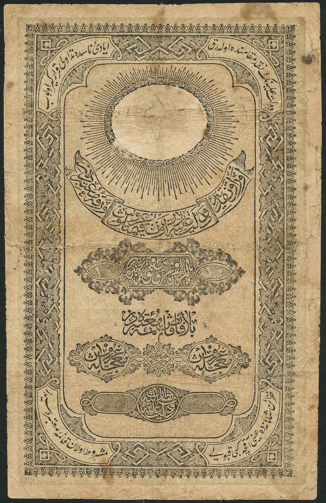 Ottoman Empire, 10 kurush, 1855-1857, black text on tan paper, black circular seal on reverse