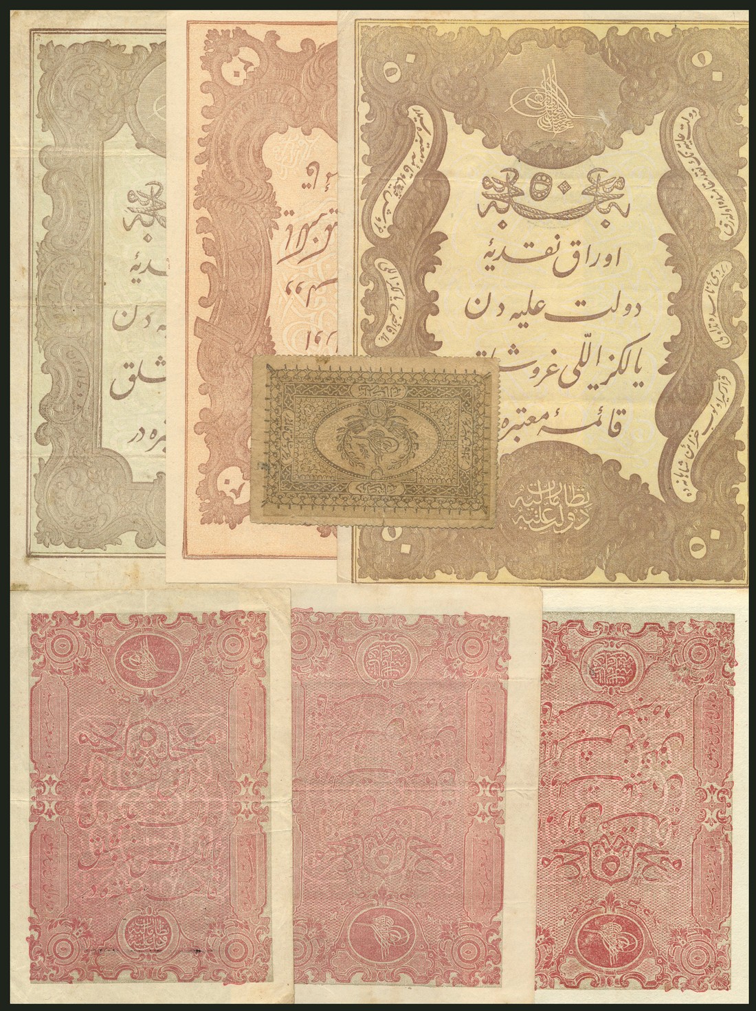 Ottoman Empire, a selection comprising 1 kurush, 1876, 5 kurush (3), 1876 (2), 1877, red, 10 kurush, brown and pale green, 1877, 20 kurush, 1877, brown and pale orange, 50 kurush,1877, brown and pale yellow