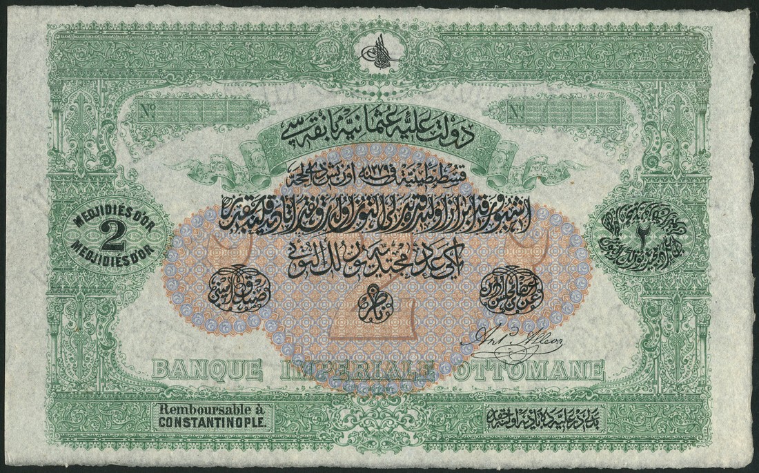 (†) Ottoman Empire, specimen 2 medjides d'or, law of 1279 (1869), no serial numbers, green, pale pink and orange, toughra of Abdul Aziz (1861-1876), value at centre and at left and right, printed signature of Aristidi at right, reverse lilac and pale blue and pink