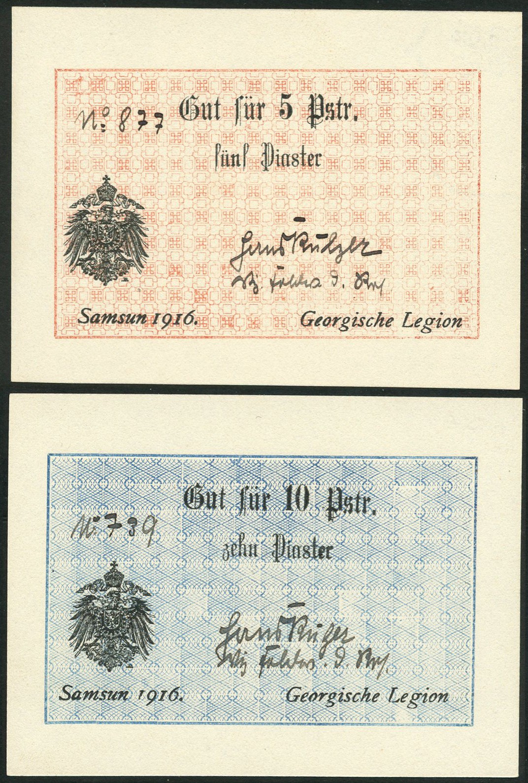 (x) Georgische Legion, 5 and 10 piastres, Samsun, 1916, serial number 877 and 739, black on red and blue underprints respectively, arms at low left