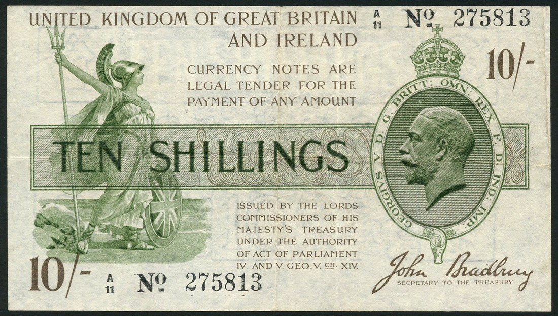 Treasury Series, John Bradbury, 10 shillings, ND (1918), prefix A11, black dash, green, white and lilac, Britannia at left, crowned head of King George V at right