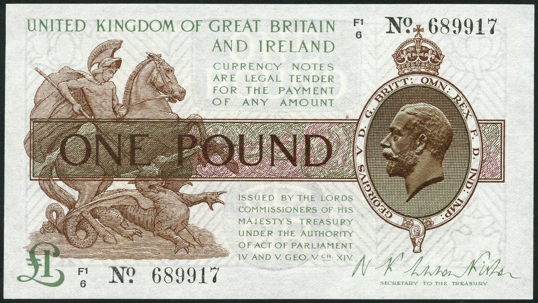 (x) Treasury series, N.F.Warren Fisher, £1, ND (26 February 1923), serial number F1/6 689917, brown, purple and green, George V at right, Saint George and the dragon at left, value at low left and in ornate tablet at centre, reverse brown, the Houses of Parliament