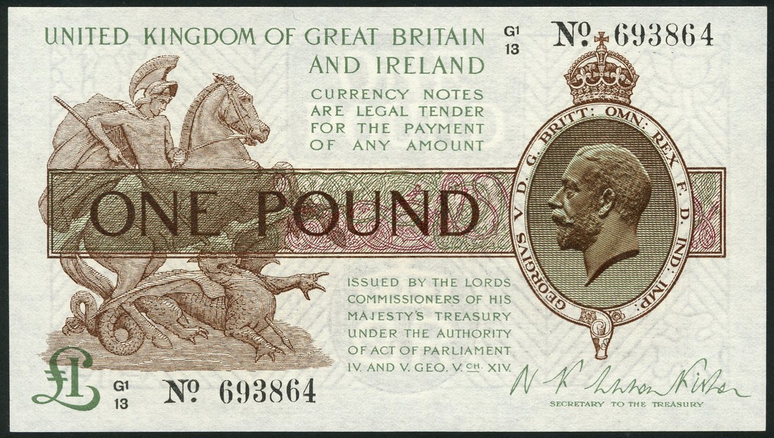 (x) Treasury series, N.F.Warren Fisher, £1, ND (26 February 1923), serial number G1/13 693864, brown, purple and green, George V at right, Saint George and the dragon at left, value at low left and in ornate tablet at centre, reverse brown, the Houses of Parliament