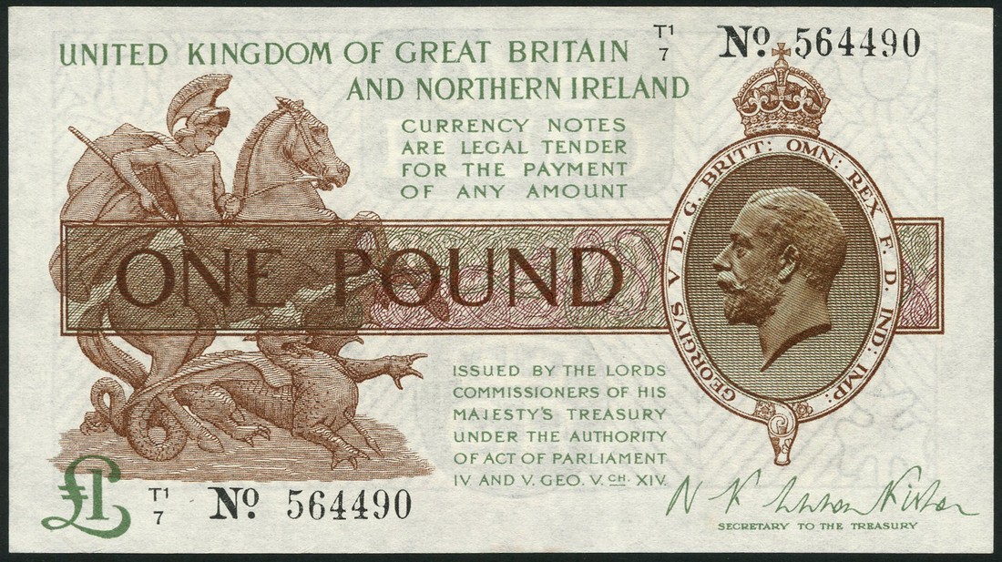 (x) Treasury series, N.F.Warren Fisher, £1, ND (25 July 1927), serial number T1/7 564490, brown, purple and green, George V at right, Saint George and the dragon at left, value at low left and in ornate tablet at centre, reverse brown, the Houses of Parliament
