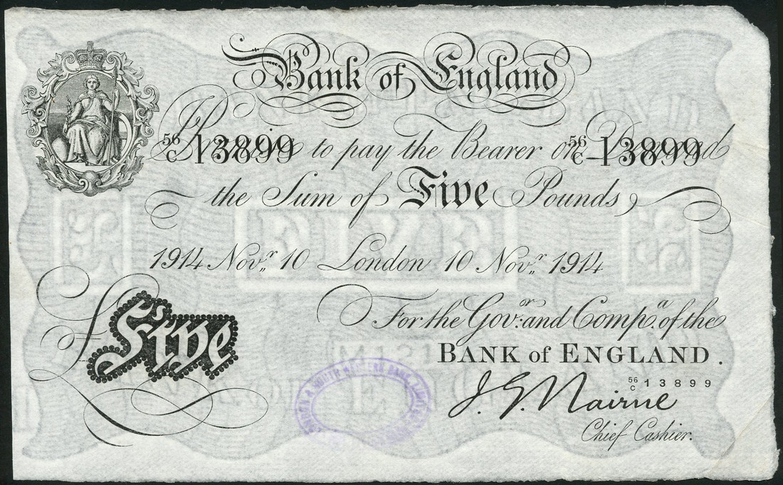 Bank of England, J.G.Nairne, £5 (2), London, 10 November 1914, serial numbers 56C 13899 and 56C 13900 black and white, ornate crowned vignette of Britannia at top left, value in black tablet at low left