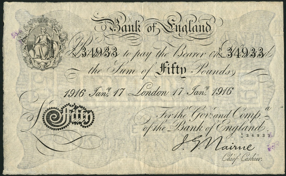 (x) Bank of England, J.G.Nairne, £50, London, 17 January 1916, serial number 8/N 34933, black and white, crowned vignette of Britannia at top left, value in black tablet at low left