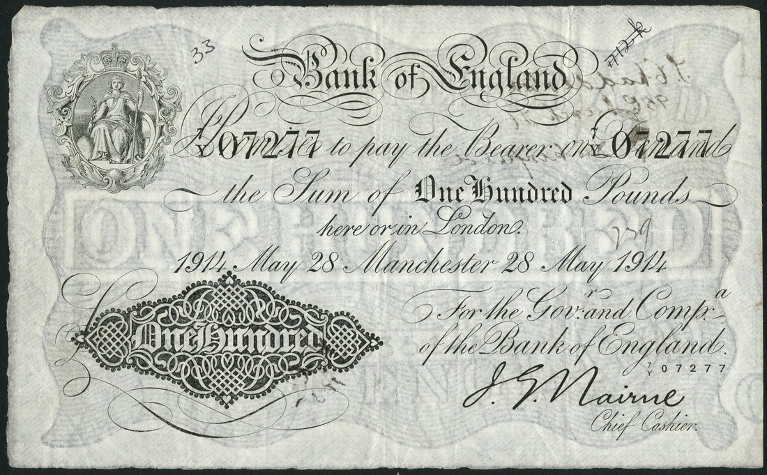 Bank of England, J.G.Nairne £100, Manchester, 28 May 1914, serial number 7/Y 07277, black and white, ornate crowned vignette of Britannia top left, value in black tablet low left