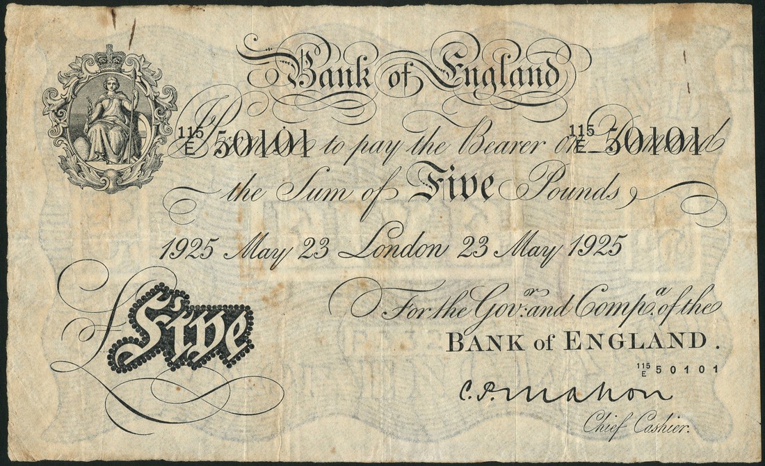 Bank of England, C.P.Mahon, £5 , London, 23 May 1925, serial numbers 115/E 50101, black and white, Britannia in ornate crowned vignette at top left, value in black tablet at low left