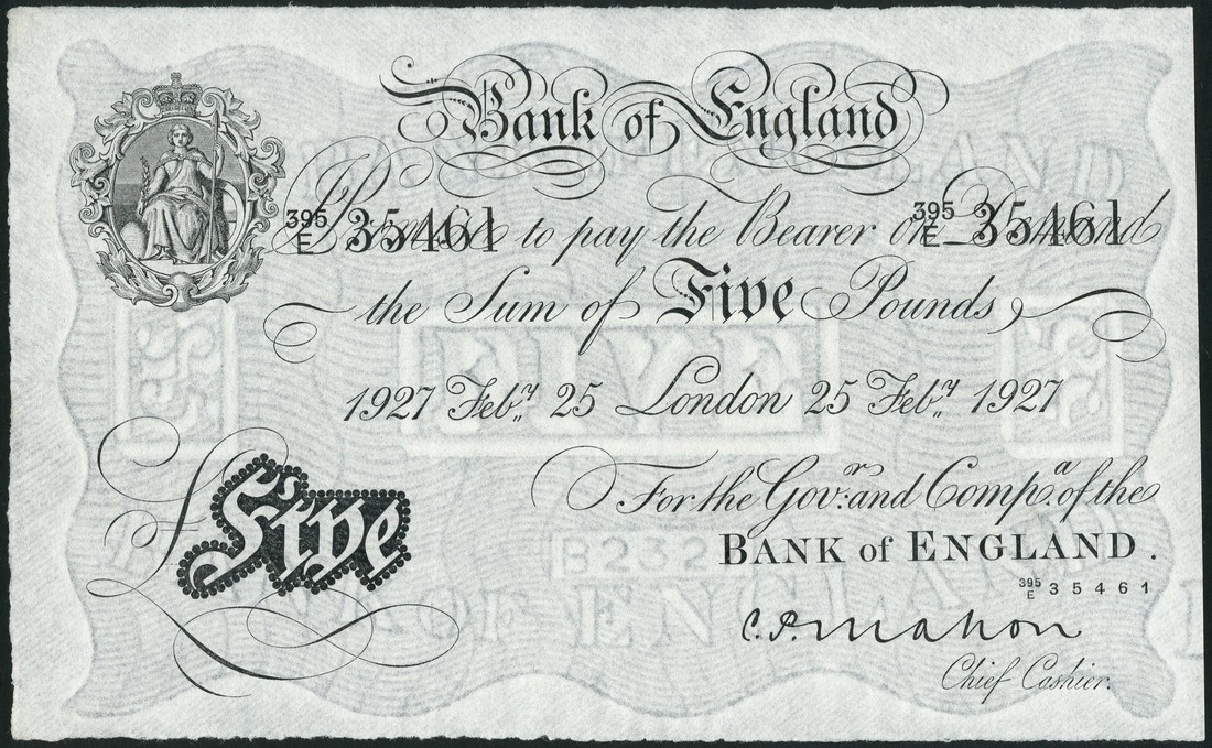 Bank of England, C.P.Mahon, £5, London, 25 February 1927, serial number 395/E 35461, black and white, ornate crowned head of Britannia top left, value in black tablet low left