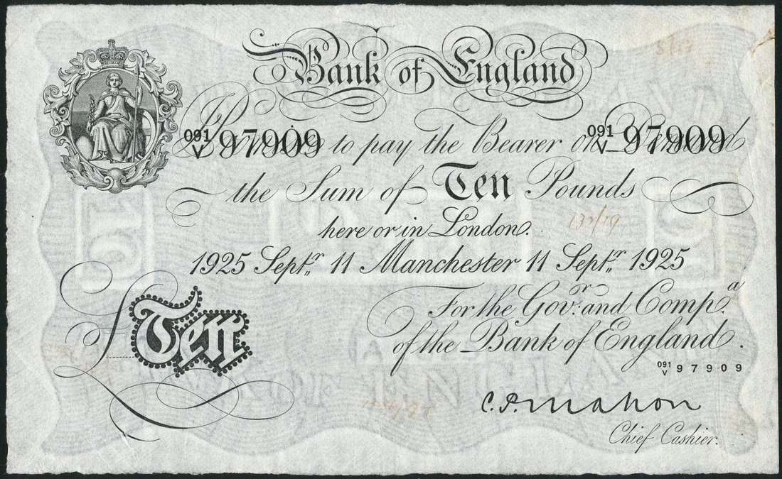 Bank of England, C.P.Mahon £10, Manchester, 11 September 1925, serial number 091V 97909 black and white, ornate crowned vignette of Britannia at top left, value in black tablet at low left