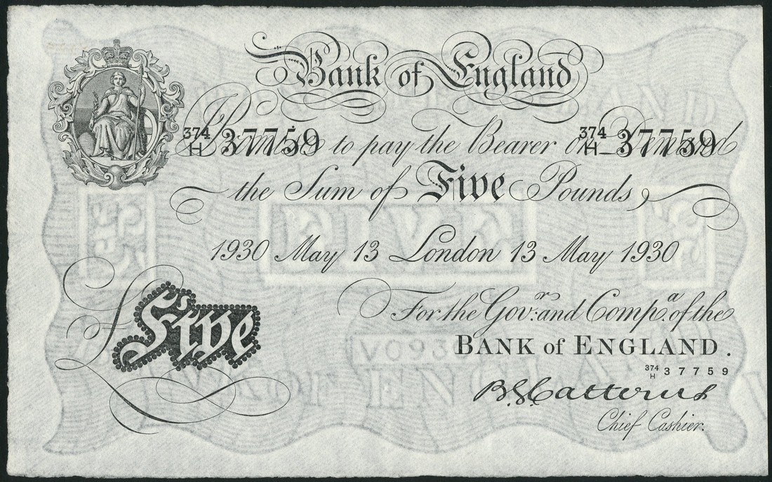Bank of England, B.G. Catterns, £5, London, 13 May 1930, serial number 374/H 37759, black and white, ornate crowned vignette of Britannia top left, value in black tablet low left