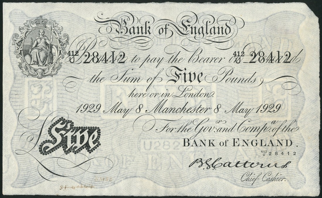 Bank of England, B.G.Catterns, £5, Manchester, 8 May 1929, serial number 412/M 28412, black and white, ornate crowned vignette of Britannia top left, value in black tablet low left