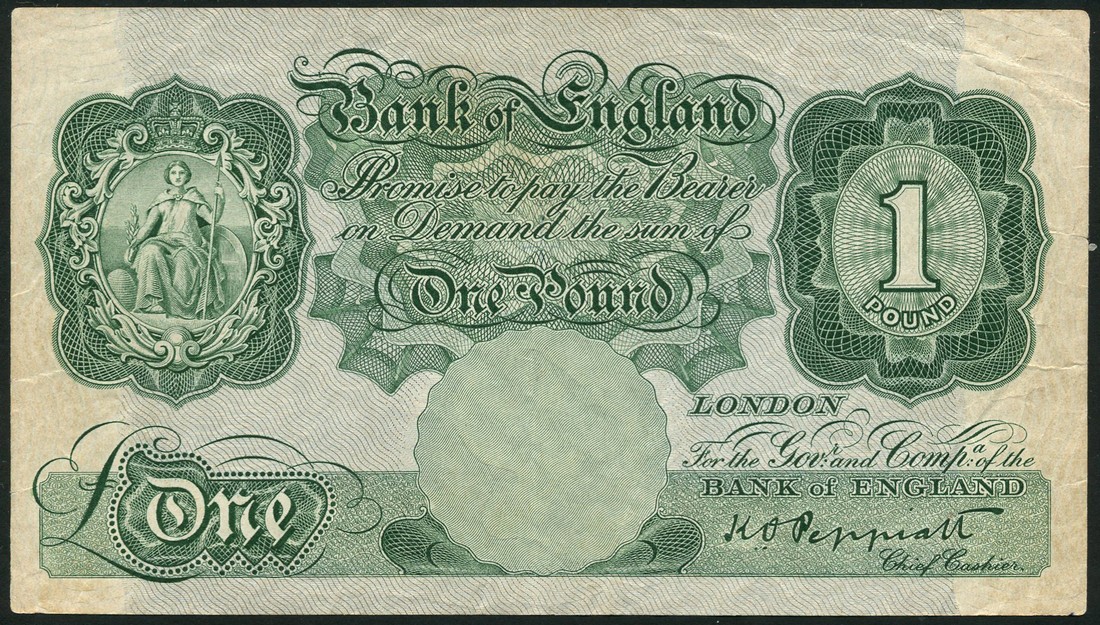 Bank of England, K. O. Peppiatt, £1, ND (1934), no serial number, green, Britannia at left, value at right