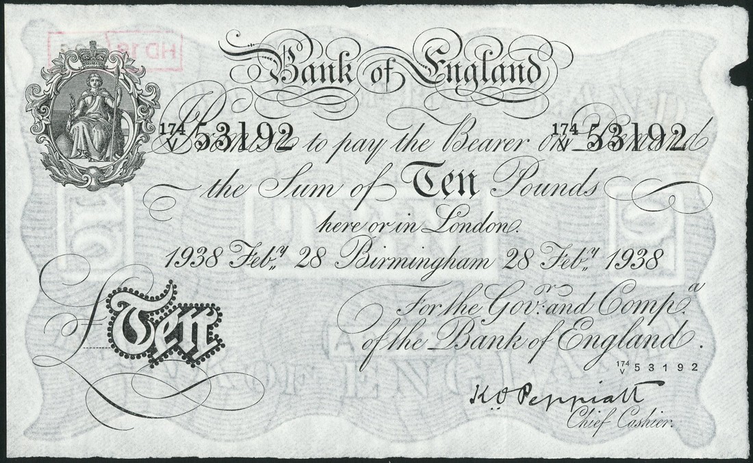 Bank of England, K.O.Peppiatt, £10, Birmingham, 28 February 1938, serial number 174V 53192, black and white, ornate crowned vignette of Britannia at top left, value in black tablet at low left