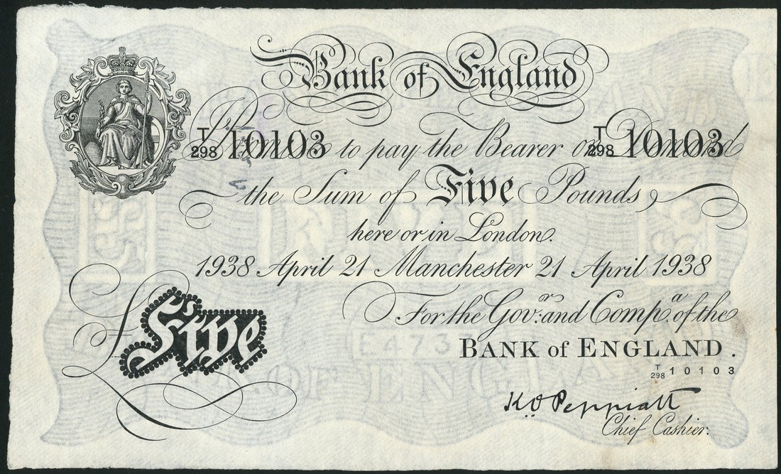 Bank of England, K.O.Peppiatt, £5 , Manchester, 21 April 1938, serial number T/298 10103, black and white, ornate crowned vignette of Britannia top left, value in black tablet low left